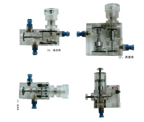 3、實(shí)訓(xùn)元件均為透明有機(jī)材料制成,便于了解掌握幾十種常用液壓元件的結(jié)構(gòu),性能及用途。掌握幾十種基本回路的工作原理,實(shí)驗(yàn)組裝回路快捷、方便。