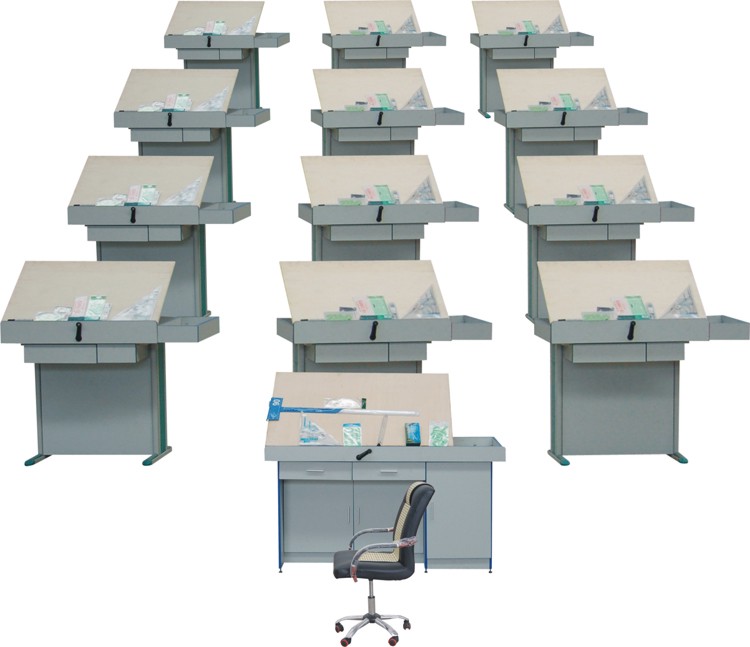 工程制圖是工程界的語言,工程制圖課程是理工科主要的技術(shù)基礎(chǔ)課,如何更快地培養(yǎng)學(xué)生的空間思維能力,更有效地掌握繪圖基本功,這是廣大師生多年愿望。 工程制圖實驗室配套系列,可以創(chuàng)造一個要求的、清新的制圖環(huán)境與學(xué)習(xí)氣氛,有利于教學(xué)計劃的順利實施與教學(xué)質(zhì)量的提高。本系列包括學(xué)生制圖桌、教師演示臺、高亮度投影儀、活動轉(zhuǎn)椅及教師桌。 工程其中學(xué)生制圖桌經(jīng)過多年的改進(jìn),具有實用方便配套齊全,輕巧大方堅固耐用拆裝方便等特點。 每桌附有: 1.“基本形體”速成小模型一套,供建立投影概念的初始階段使用。 2.繪圖工具和儀器: a.一號圖板及相應(yīng)的一字尺裝置一套。 b.三角板(30厘米)一付、曲線板,比例尺,不銹鋼多用擦圖片各一付。 c.繪圖儀器(5件)、繪圖墨水筆(3支)各一盒。 d.常規(guī)與各種專業(yè)模板。 3.兩種制圖國家標(biāo)準(zhǔn)選用。